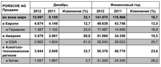 В 2012 году компания Porsche смогла обеспечить себе во всех регионах рост продаж, исчисляемый двузначными цифрами. Лидером по продажам стал Азиатско-тихоокеанский регион, в котором было продано 50 376 автомобилей (+23,6 процента по сравнению с результатами предыдущего года). С небольшим отрывом за ним следует европейский регион, в котором штуттгартский производитель спорткаров продал 49 639 новых автомобилей (+13,5 %). Впервые на китайском рынке было продано более 30 000 новых автомобилей, а именно 31 205 штук. Самым успешным отдельным рынком в плане продаж в 2012 году стал рынок США: В Соединенных Штатах свой выбор в пользу моделей Porsche сделали 35 043 покупателя (+20,7%). Продолжают пользоваться большой популярностью 911, Cayenne, Panamera, Boxster и Cayman и на рынке самого производителя - в Германии. Здесь было продано в общей сложности 17 487 автомобилей (+16,9 %).